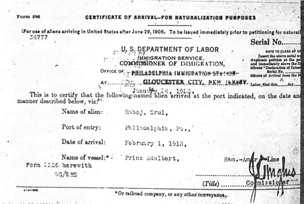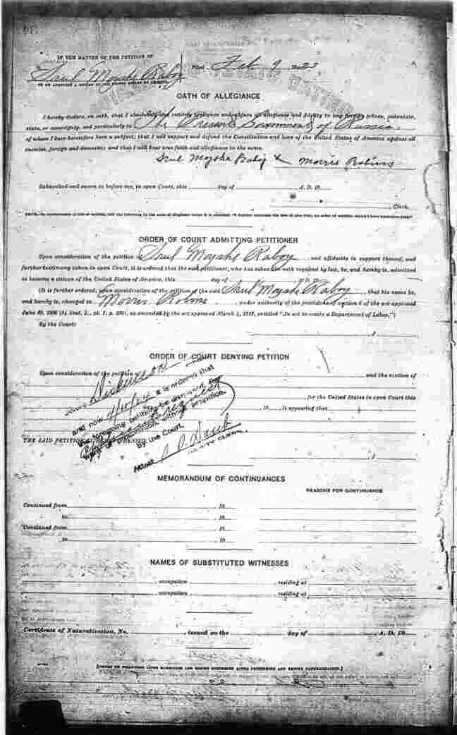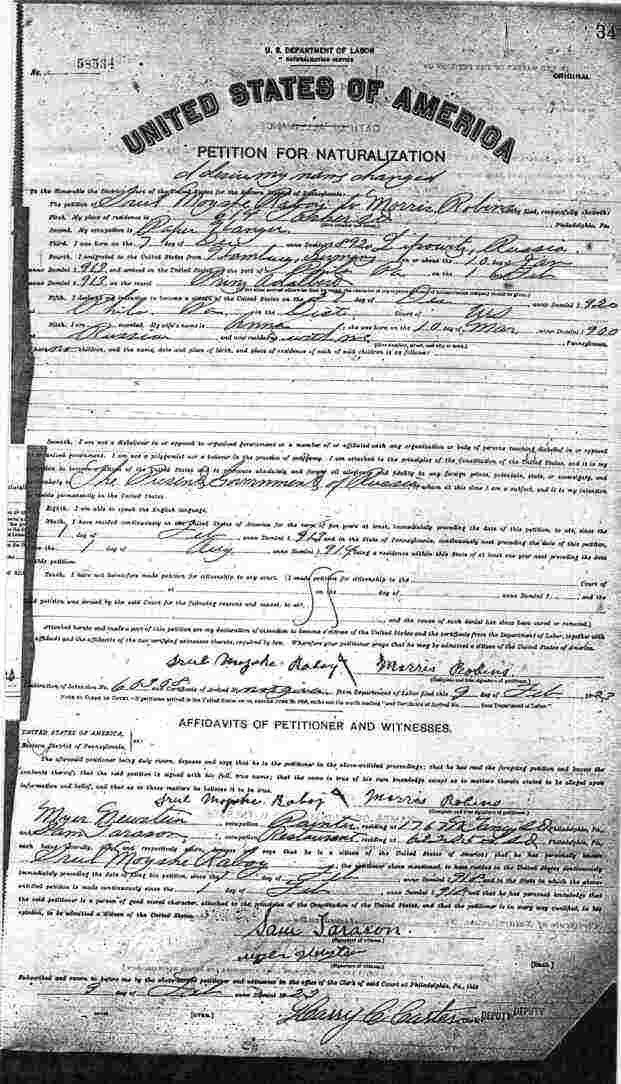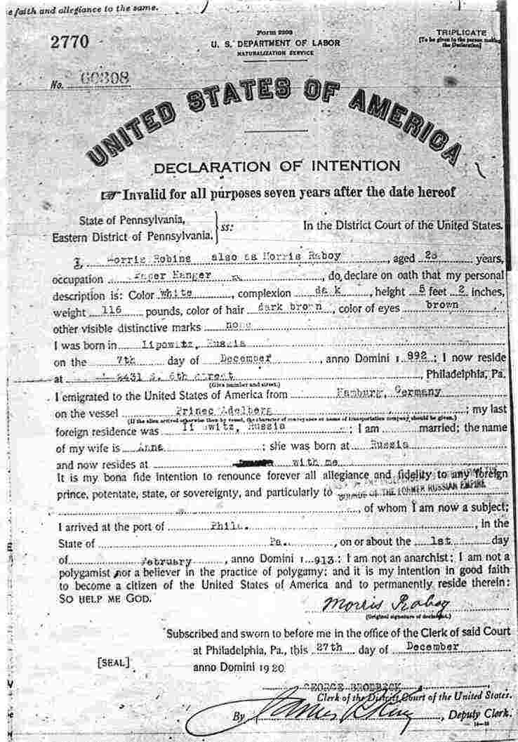 MORRIS ROBINS DOCUMENTS Declaration of Intention to Become a Citizen: December 27, 1920 Petition for Naturalization (page one): February 9, 1923. Petition for Naturalization (page two): February 9, 1923. |